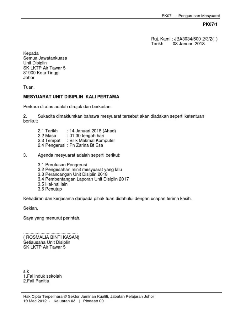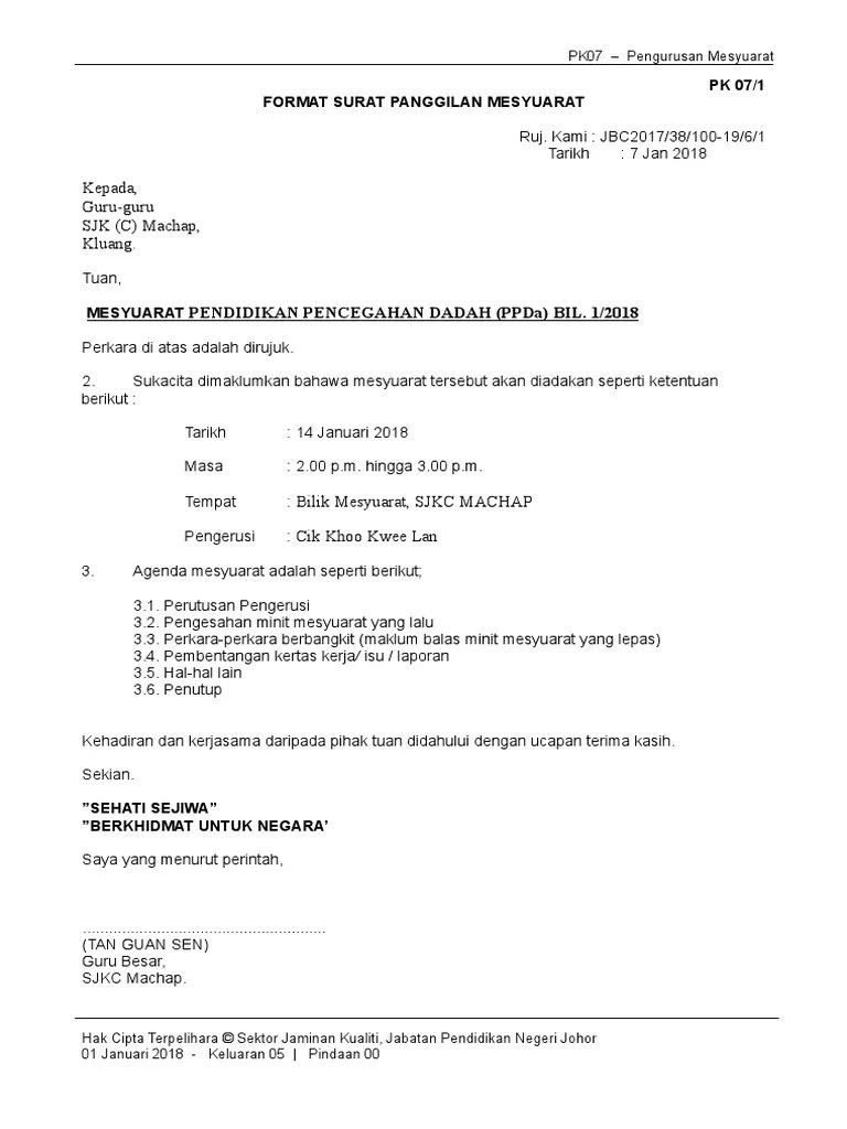 PK07 Pengurusan Mesyuarat PK 071 SURAT PANGGILAN MESYUARAT Ruj. Surat panggilan mesyuarat 2020 kali kedua 42 senarai tugas guru kebenaran hanya akan dipertimbangkan sekiranya urusan tersebut tidak dilakukan di luar waktu persekolahan dan. Nama sekolah berkhidmat untuk negara saya yang.